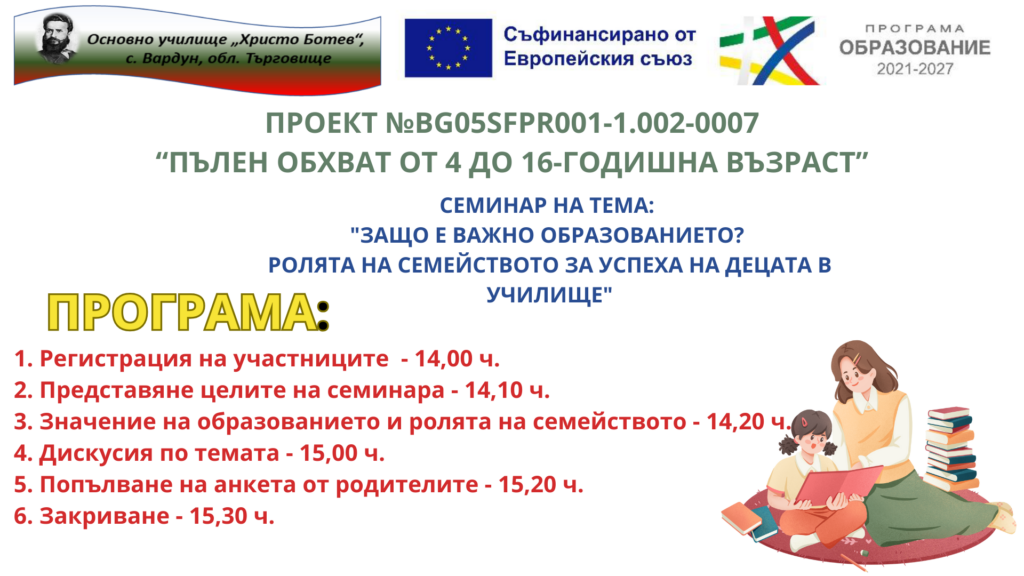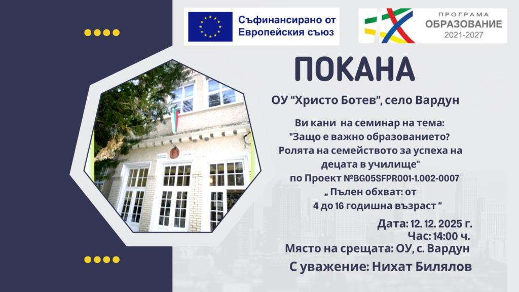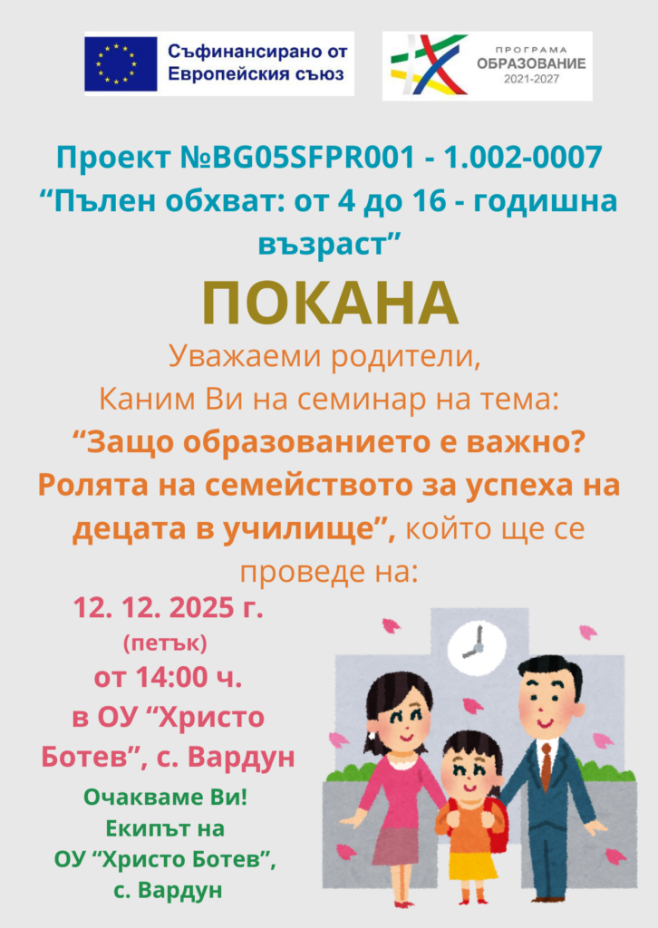 На 12.12. 2025 год. екипът на ОУ „Христо Ботев“, с. Вардун, работещ по  Проект №BG05SFPR001-1.002-0007 „Пълен обхват: от 4 до 16-годишна възраст“, проведе семинар по поддейност 1.3 Работа с родители за разясняване на ползите от образованието. Присъстваха родители на учениците от училището и гости /бивши възпитаници на училището и  кмета на селото/.