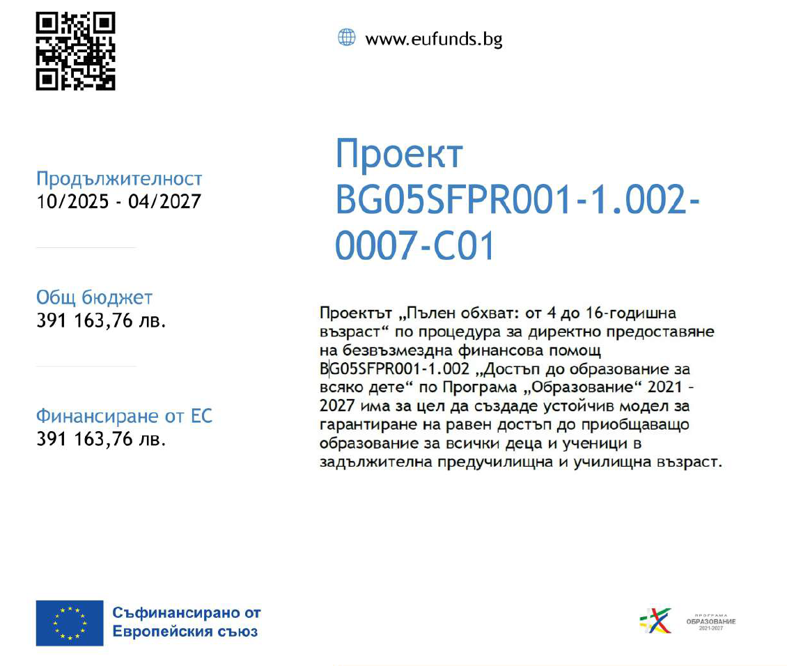 Проектът „Пълен обхват: от 4 до 16-годишна възраст“ има за цел да създаде устойчив модел за гарантиране на равен достъп до приобщаващо образование за всички деца и ученици в задължителна предучилищна и училищна възраст (4–16 години) в общините Търговище, Омуртаг и Антоново.